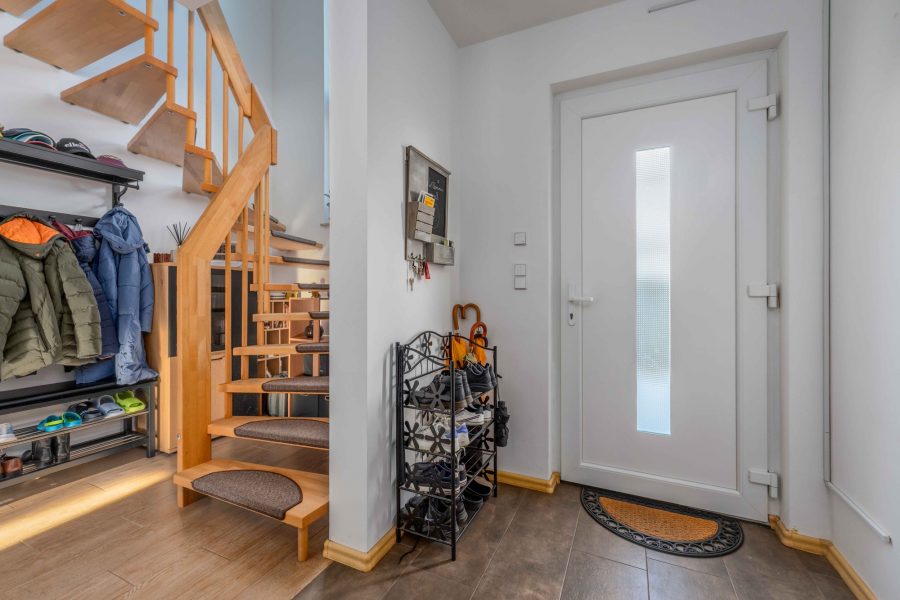 Das Erdgeschoss empfängt Sie mit einem großzügigen Eingangsbereich. Ein komfortables Gäste-WC mit bodentiefer Dusche und ein weiträumiges Büro bzw. Gästezimmer bieten vielseitige Nutzungsmöglichkeiten – ideal für Homeoffice. Der praktische Hauswirtschaftsraum beherbergt die moderne Luftwärmepumpe für die effiziente Fußbodenheizung und bietet reichlich Stauraum.