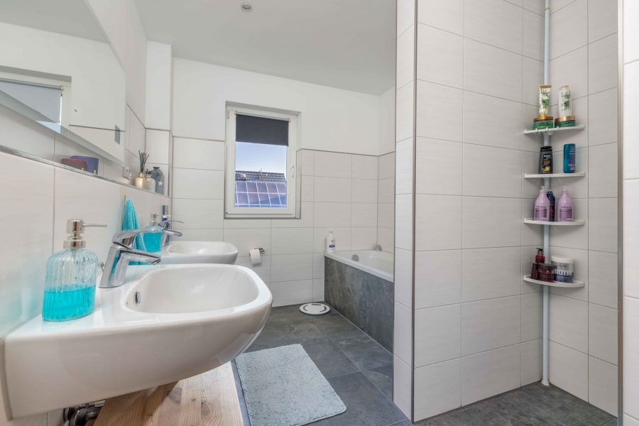 Eine elegante Massivholztreppe führt ins Obergeschoss mit großzügigem Hauptschlafzimmer und Ankleide, einem weiteren Schlafzimmer, Gästezimmer sowie zwei gleich großen Kinderzimmern – perfekt für Familien. Das moderne Badezimmer überzeugt mit bodentiefer Dusche, Badewanne und zwei Waschbecken.